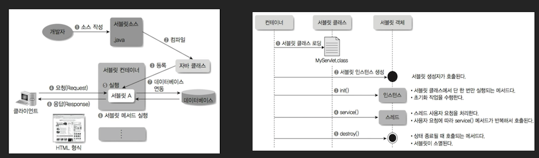 :자바에서 만든 CGI의 확장형 인터페이스이다. 멀티스레드 방식으로 동작하여 하나의 요청은 스레드로 처리하여 메모리 낭비를 줄이고 싱글톤 패턴을 지원하여 같은 구현체는 한번만 생성하여 사용하게 된다.
