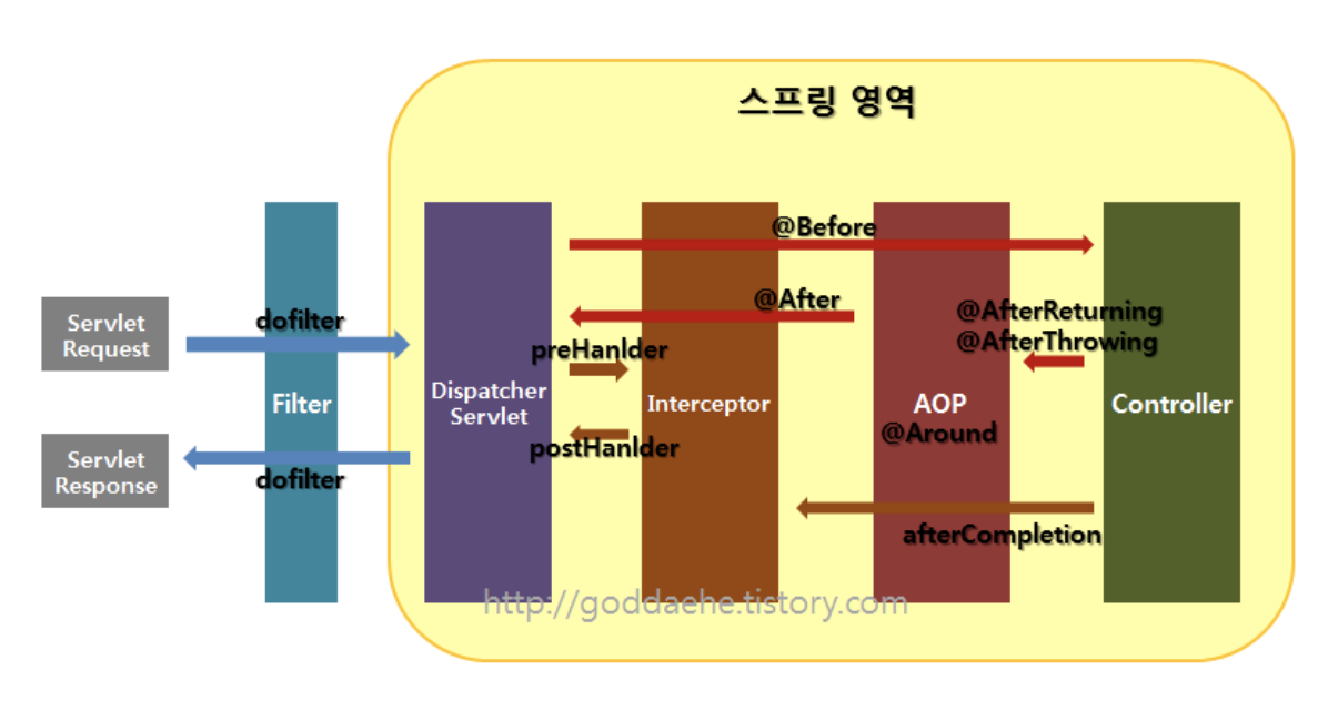 - 위의 그림에서 알 수 있듯 Dispatcher Servlet 이전에 실행된다.