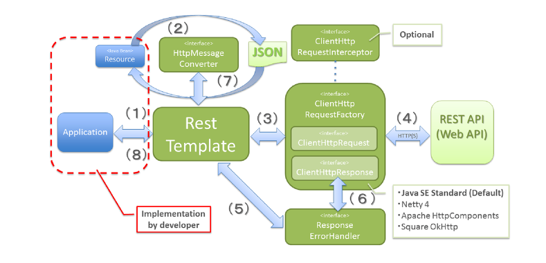 - 어플리케이션이 RestTemplate를 생성하고, URI, HTTP메소드 등의 헤더를 담아 요청한다.