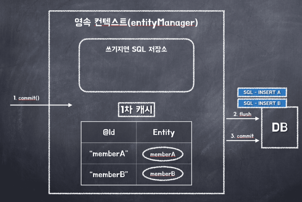 //두개의 Insert 쿼리문을 영속성 컨텍스트의 쓰기 지연 SQL 저장소에 쌓아둠